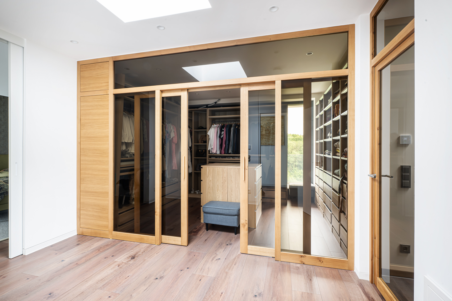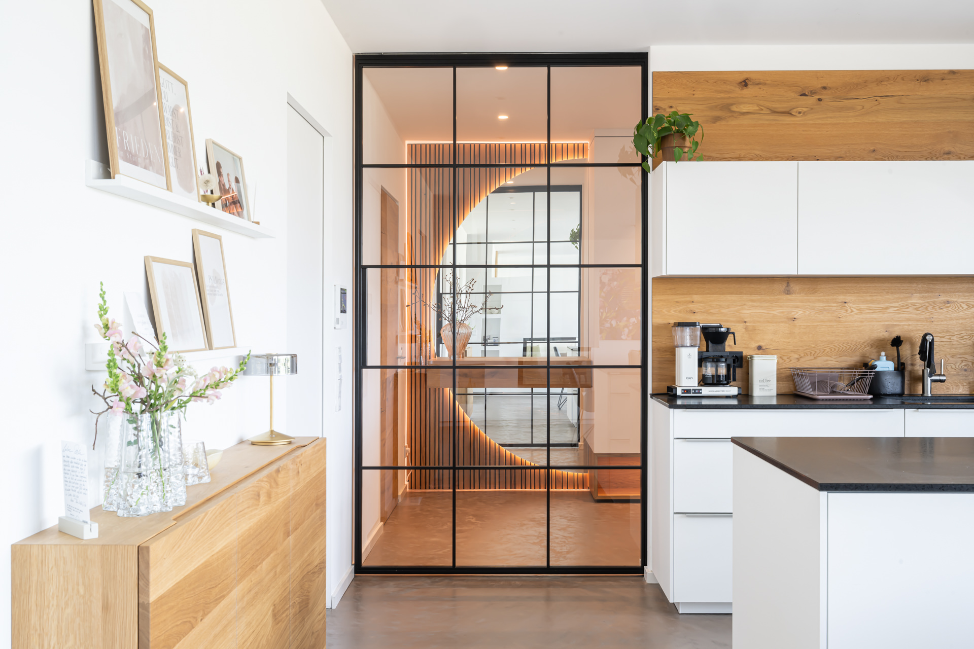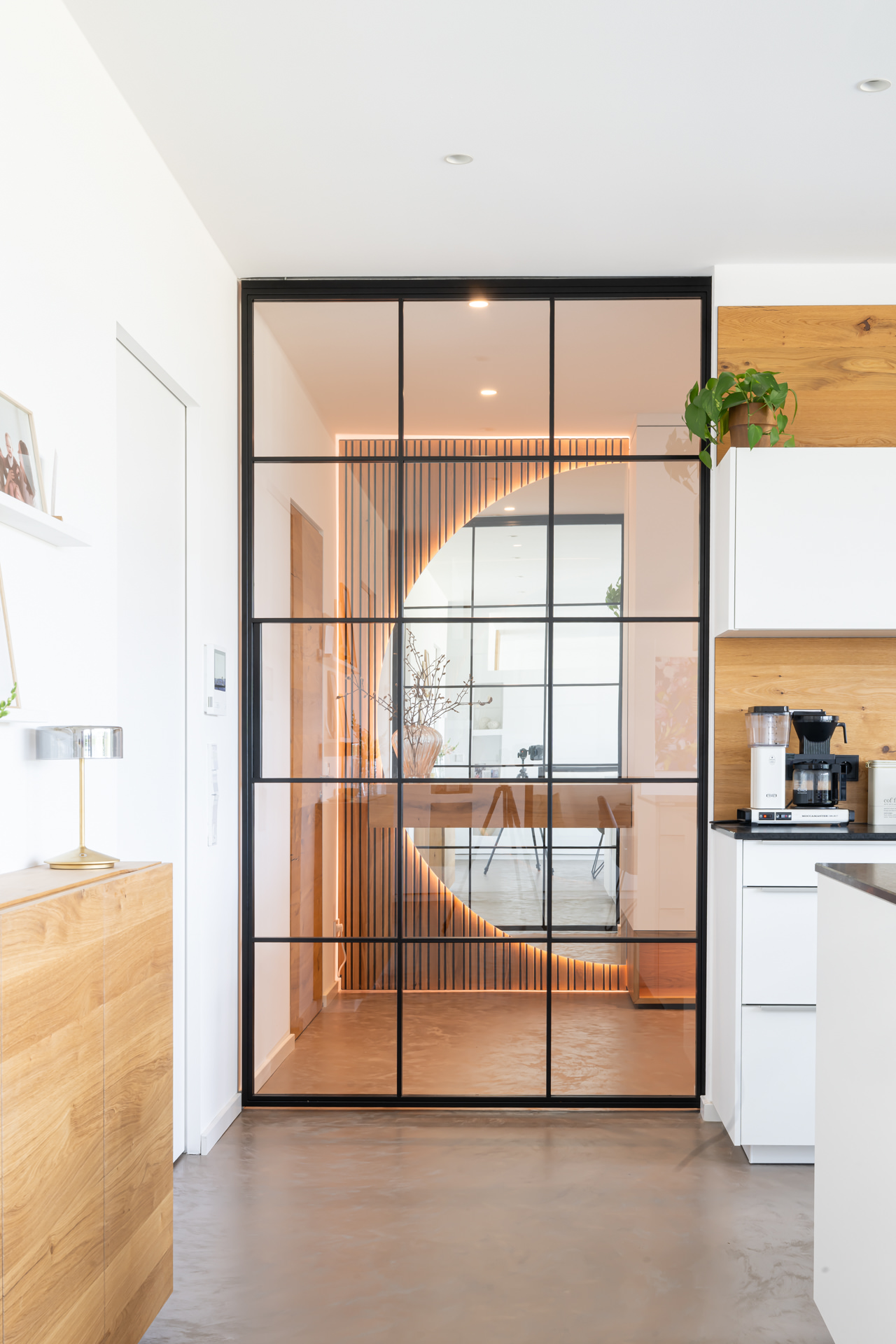 SCHIEBETÜRELEMENTE AUS EICHE UND RAUCHGLAS