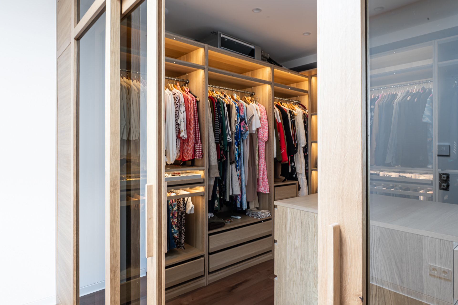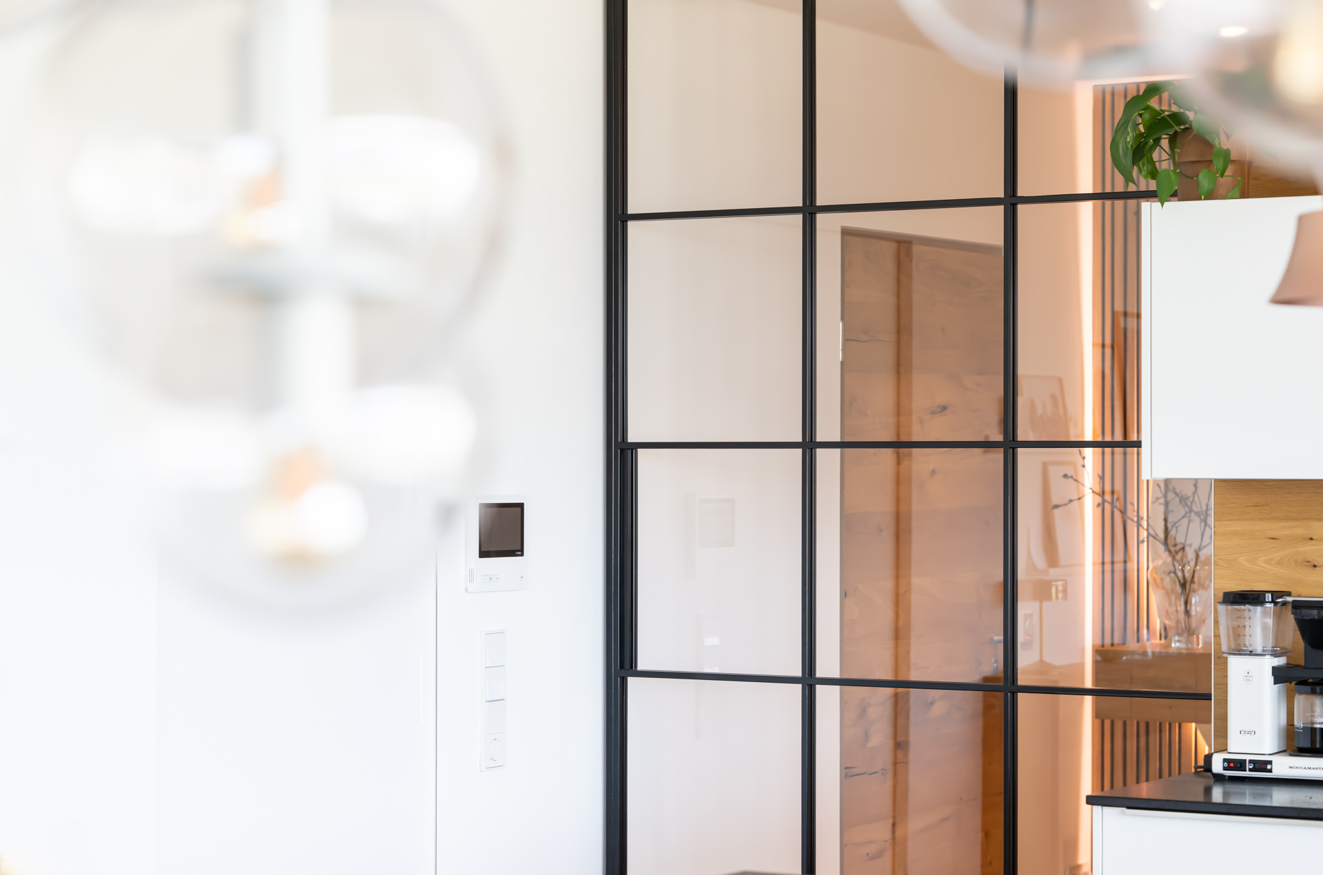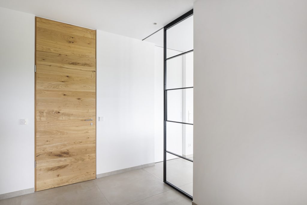 SCHIEBETÜRELEMENTE AUS EICHE UND RAUCHGLAS