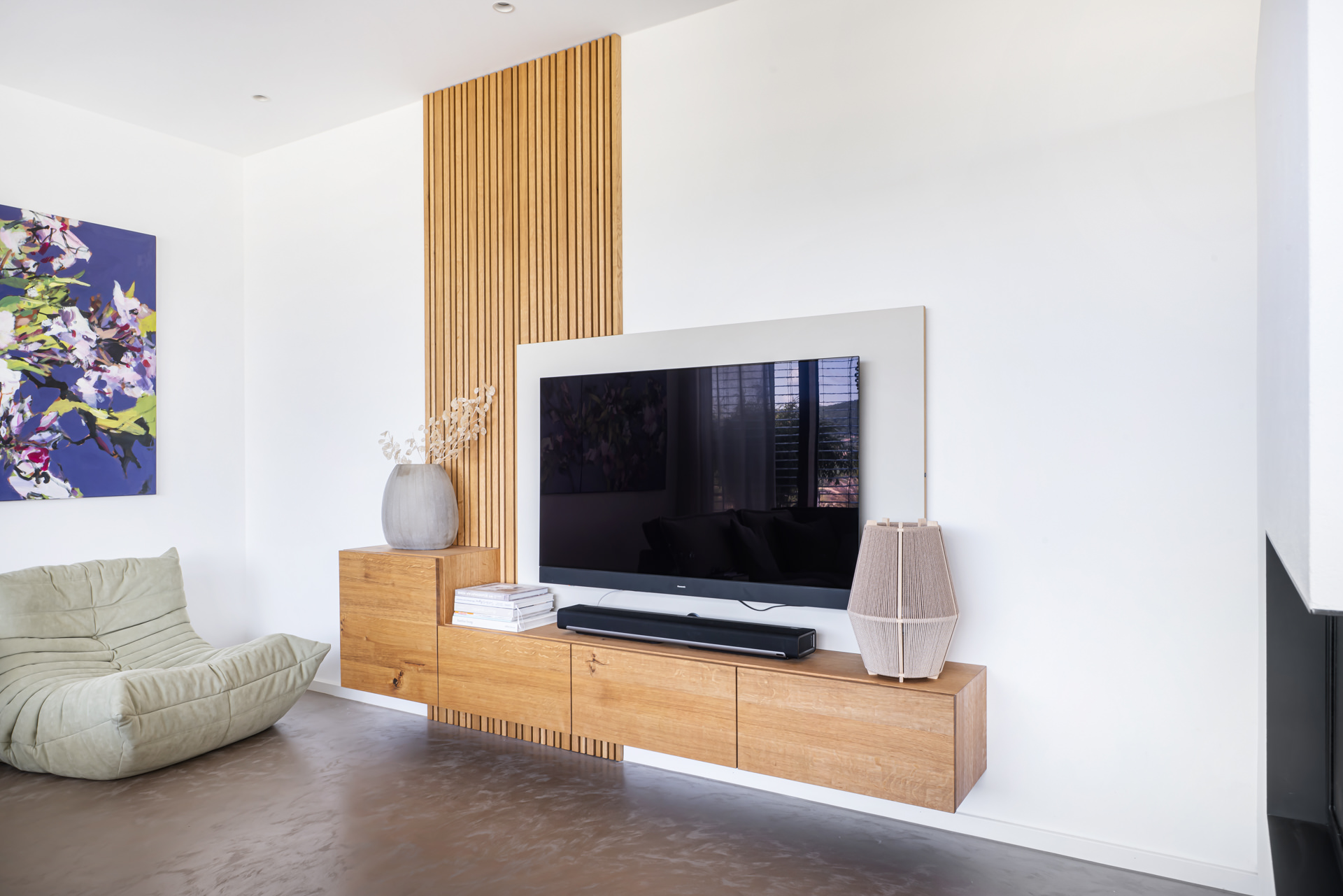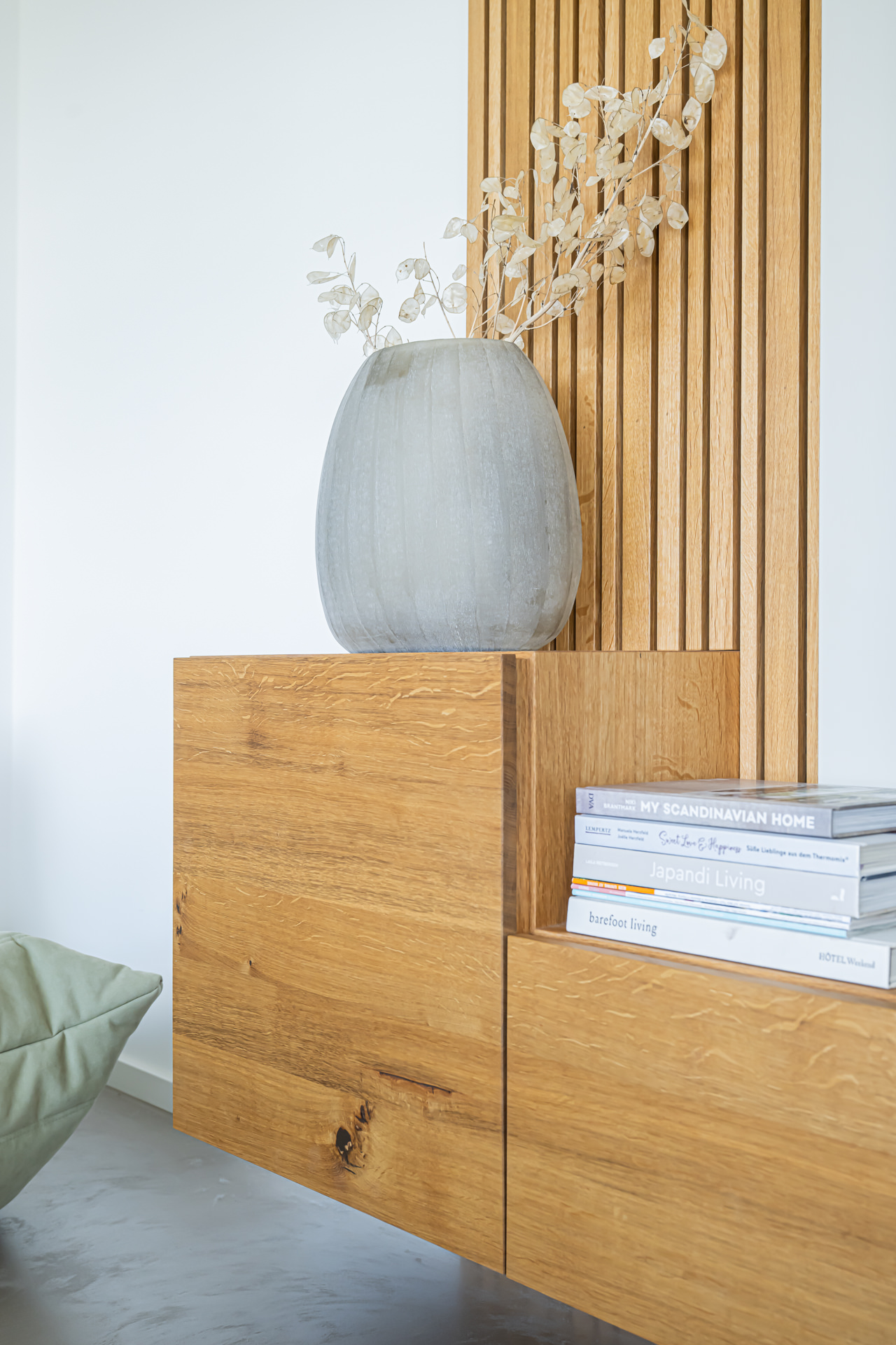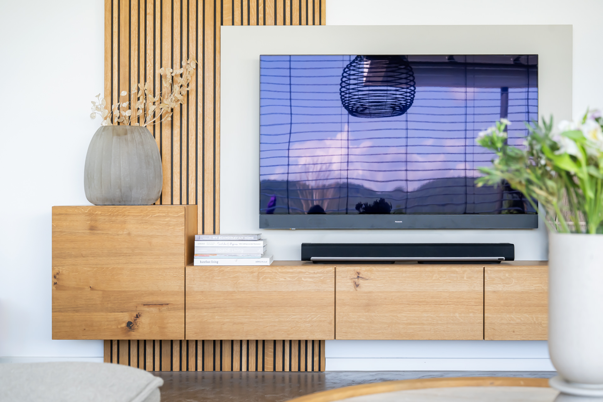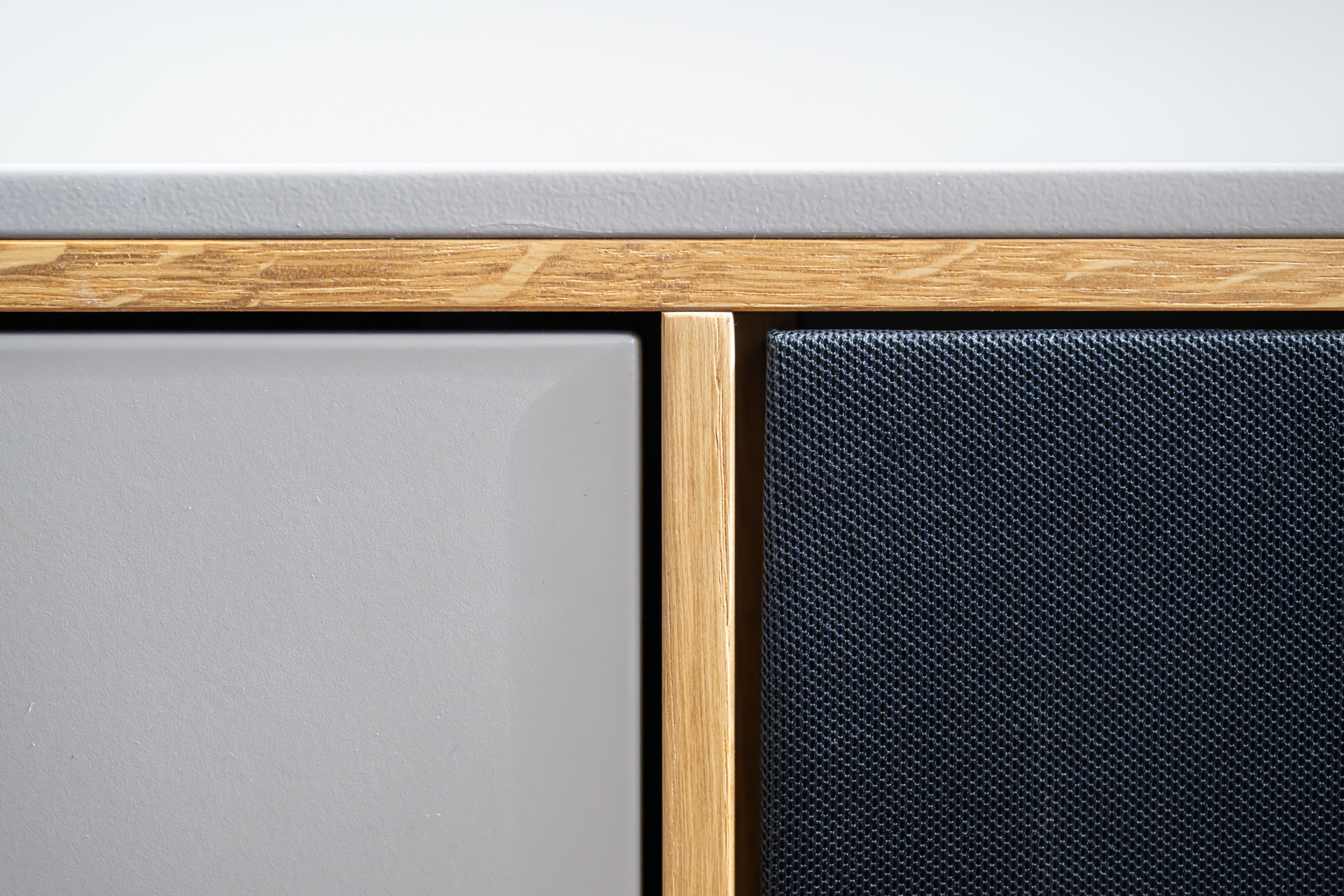 FERNSEHWAND IN EICHE UND FARB-MATT-LACK UND AKUSTIKSTOFF