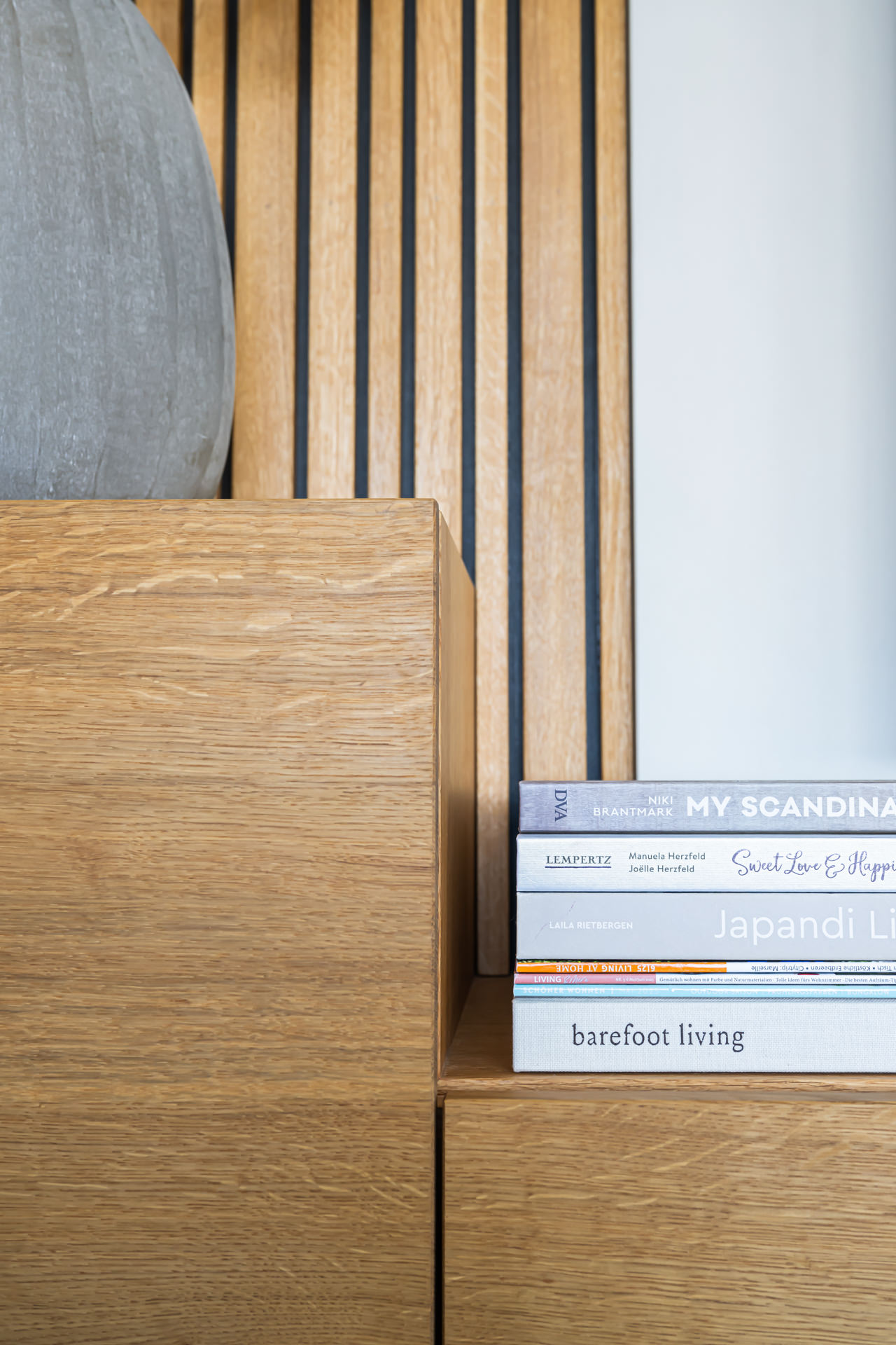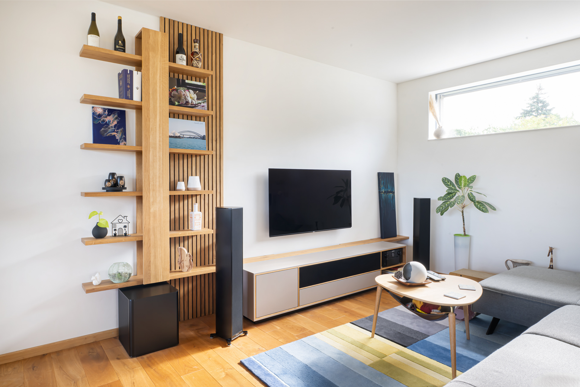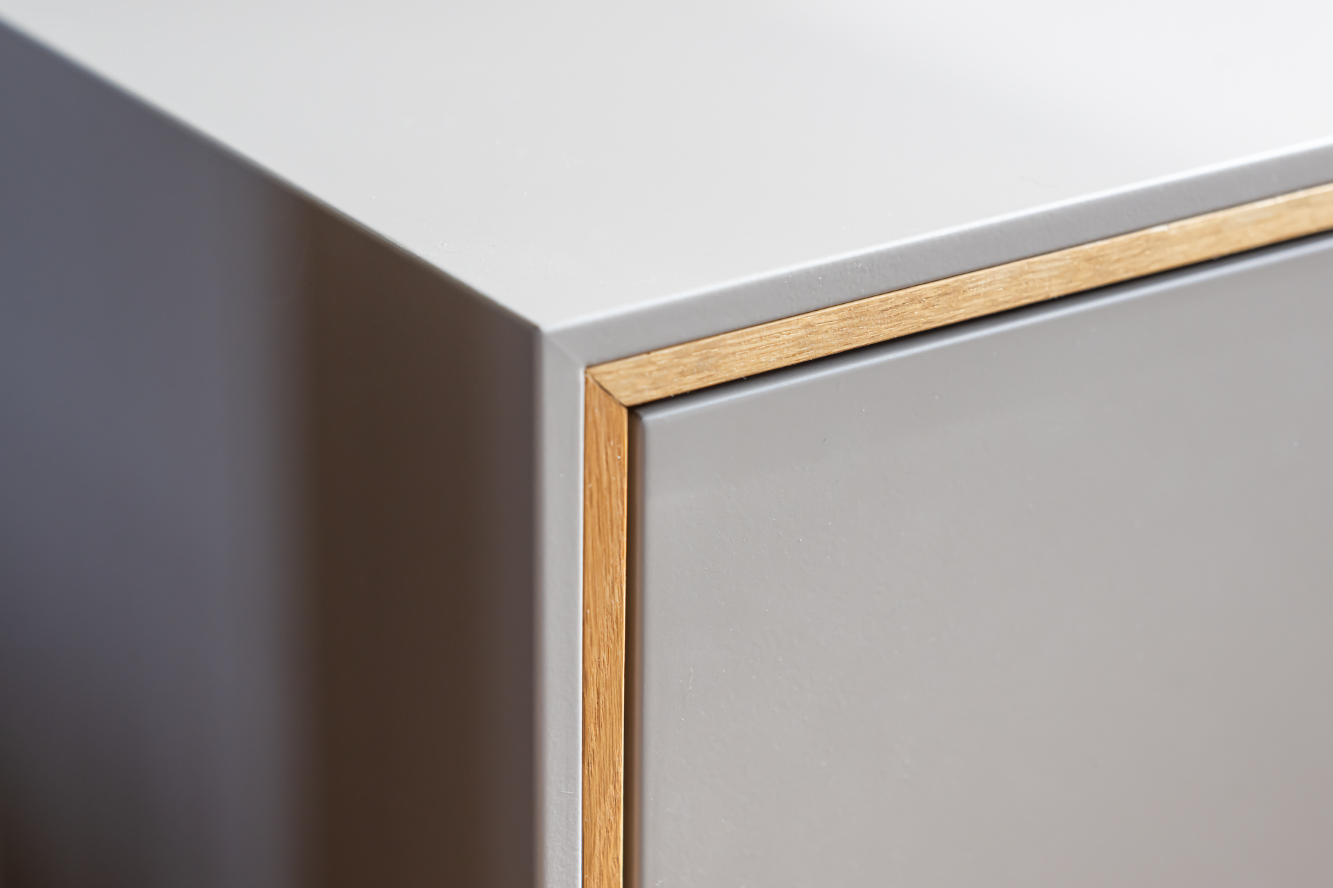 FERNSEHWAND IN EICHE UND FARB-MATT-LACK UND AKUSTIKSTOFF