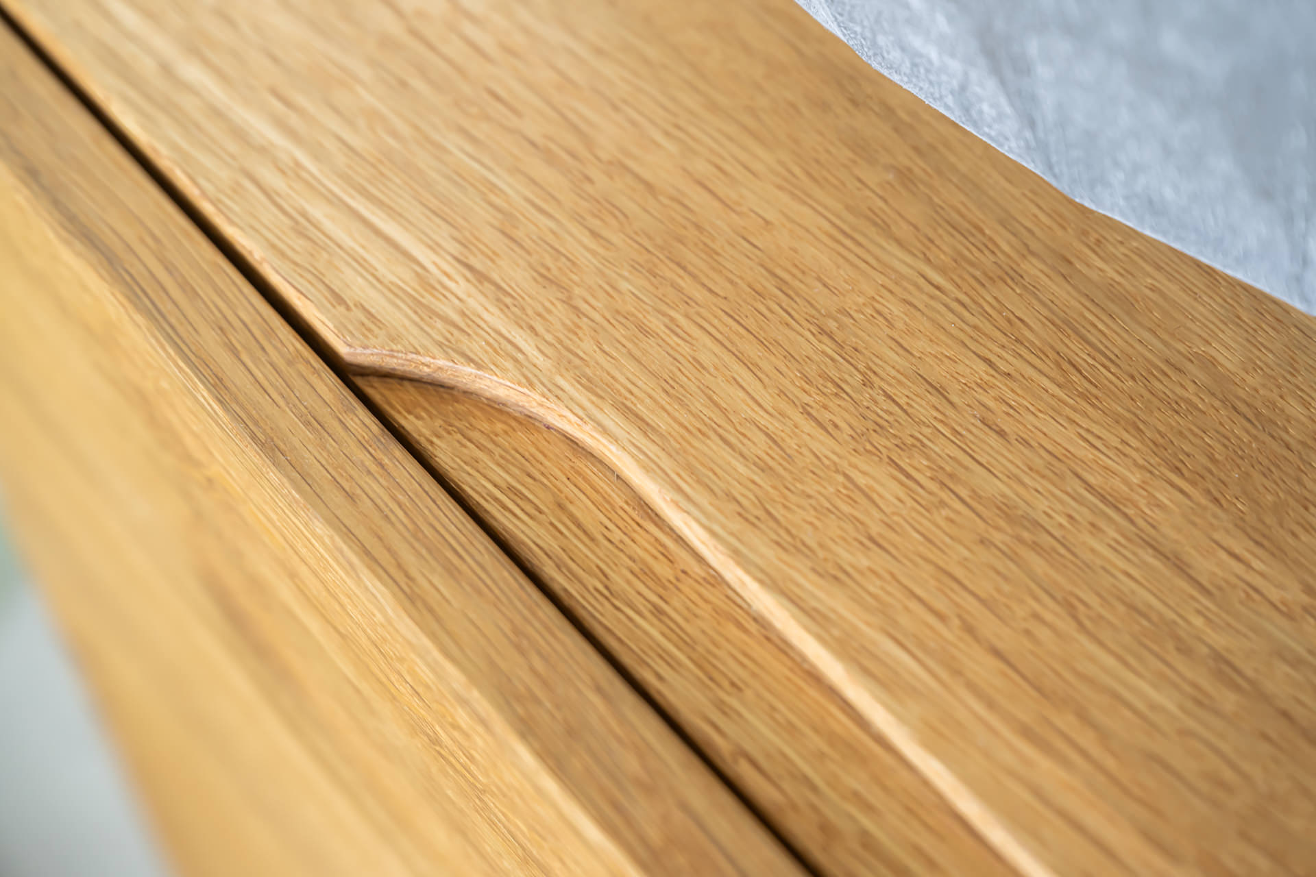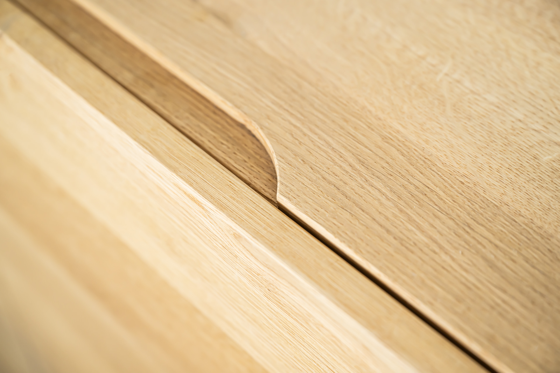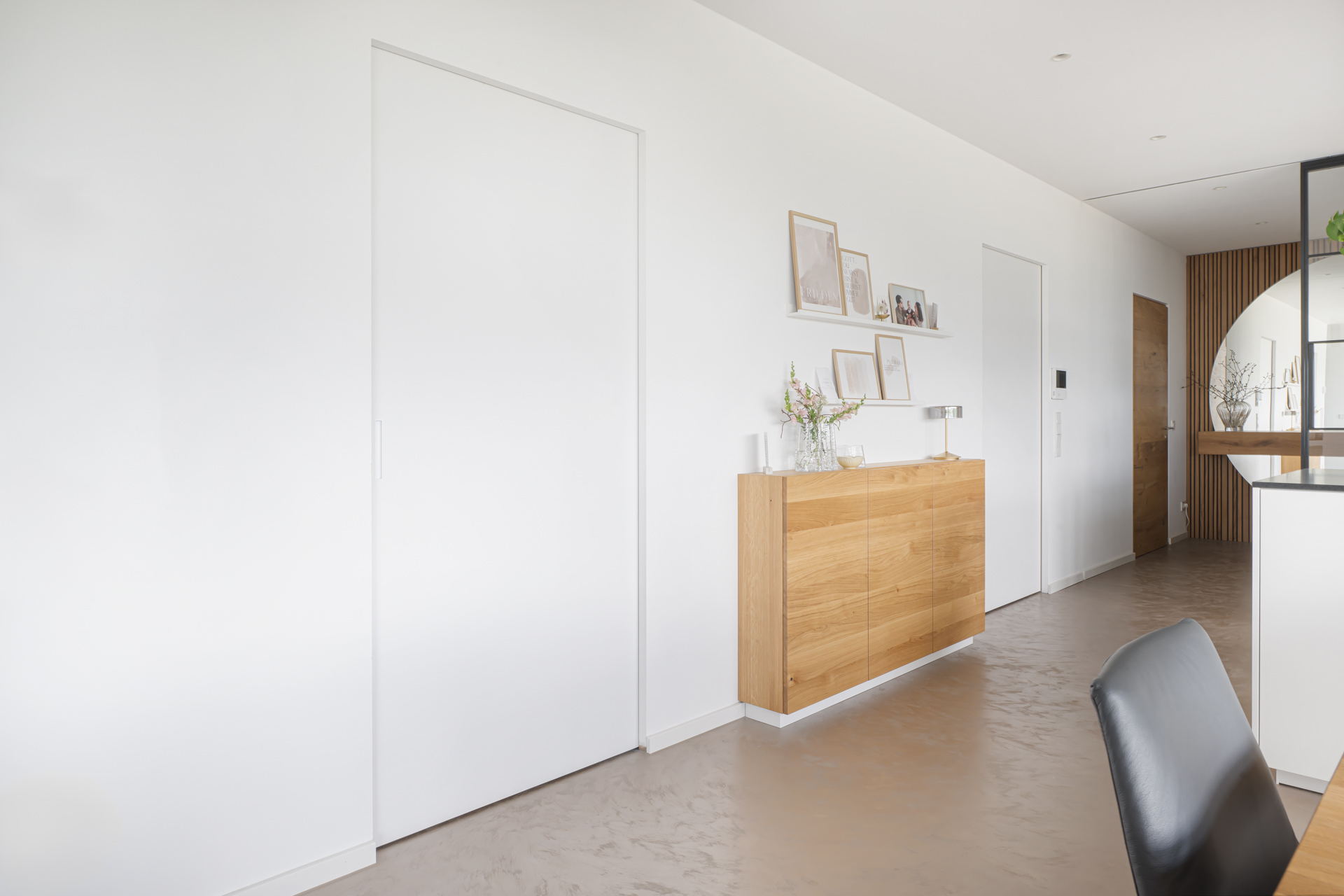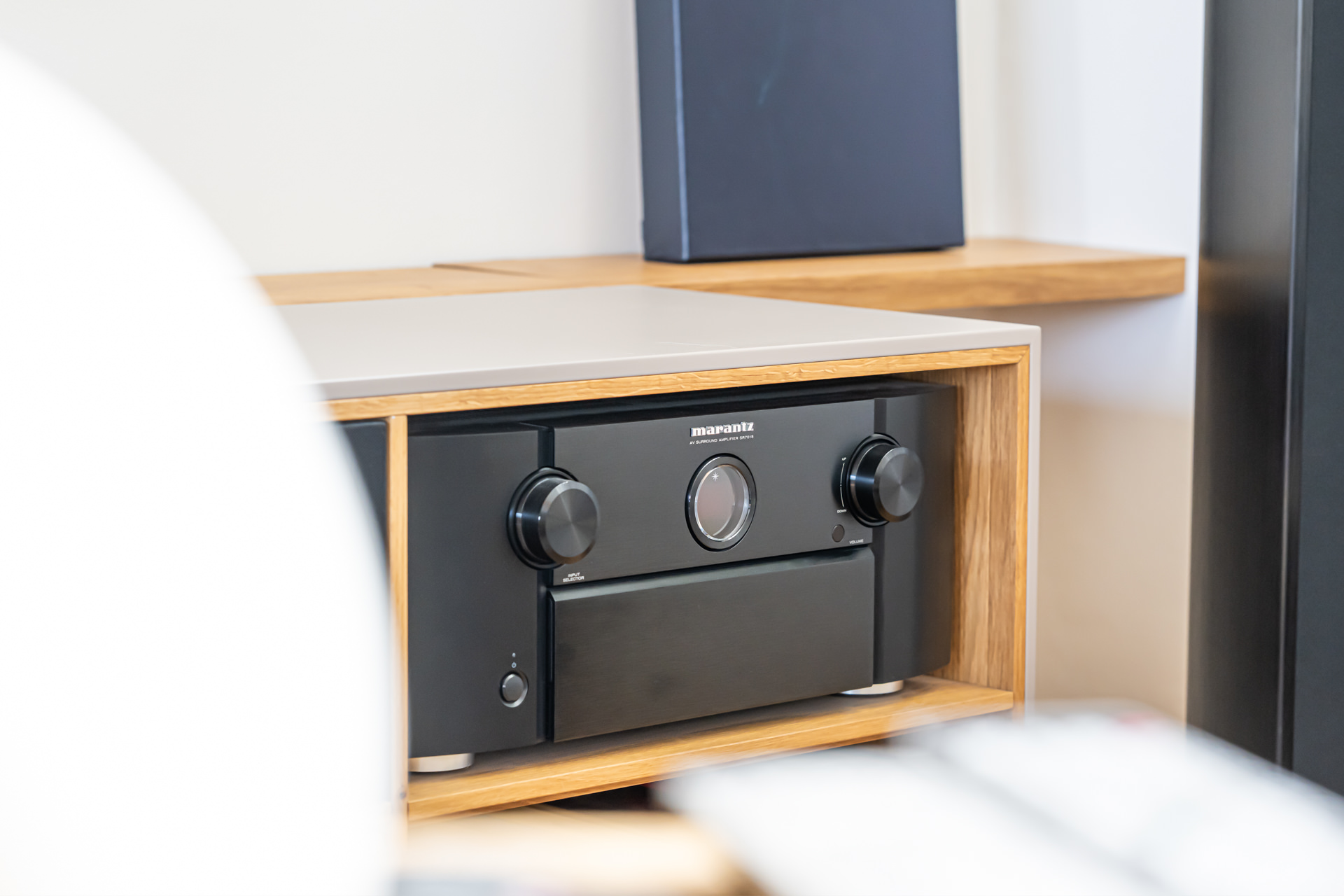 FERNSEHWAND IN EICHE UND FARB-MATT-LACK UND AKUSTIKSTOFF